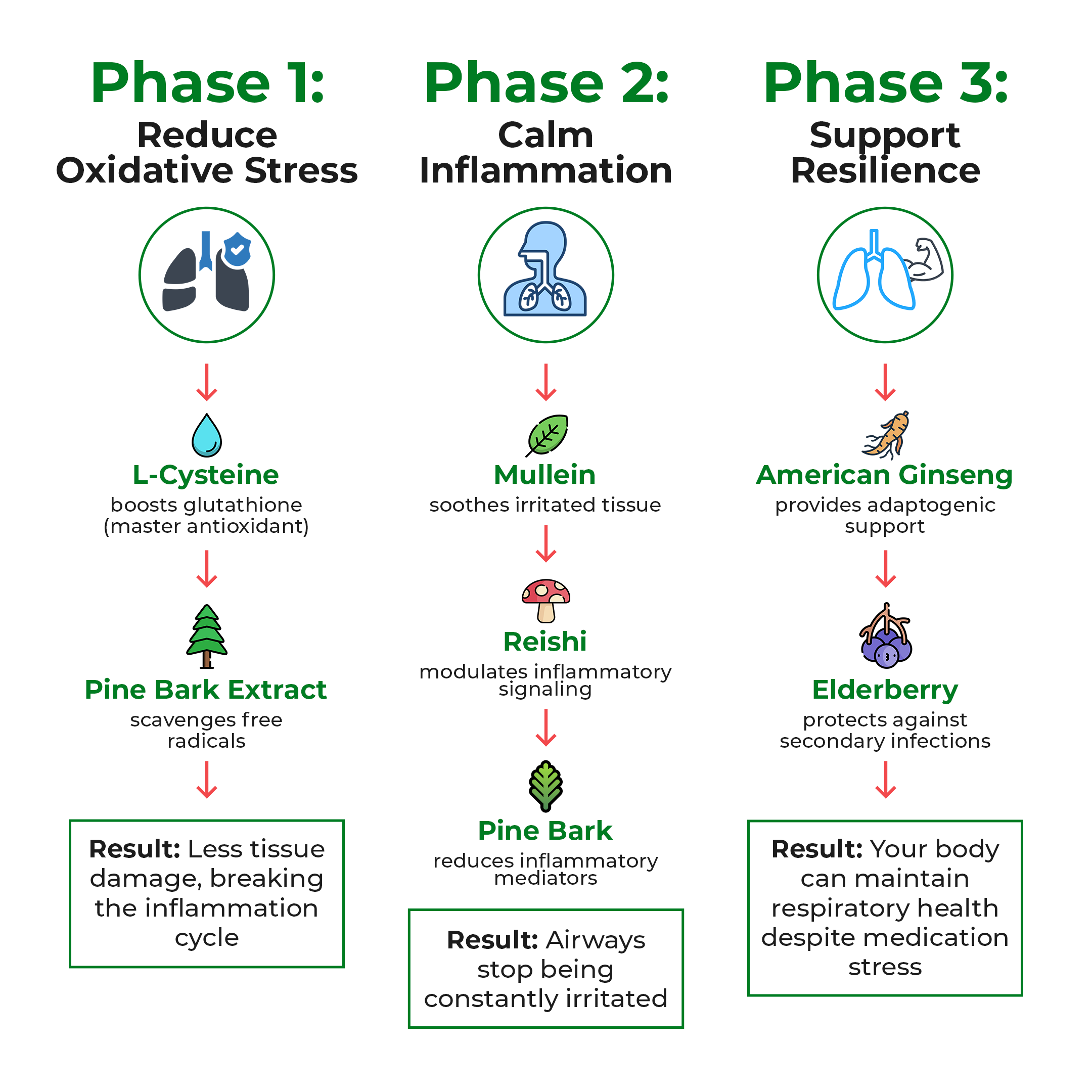 Phase 2 (Weeks 3-6): Mullein soothes inflamed airways while Reishi modulates the inflammatory response. Daytime cough frequency typically drops 50-70%.