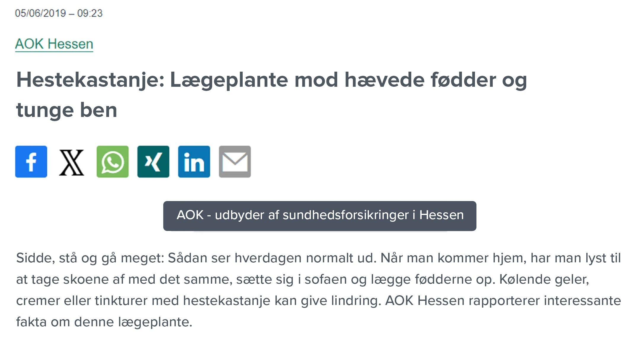 Da jeg senere selv dykkede ned i emnet, fandt jeg endda en artikel fra sundhedsforsikringen AOK Hessen, som anbefalede hestekastanjeekstrakt som et hjemmemiddel mod væskeophobning og tunge ben: