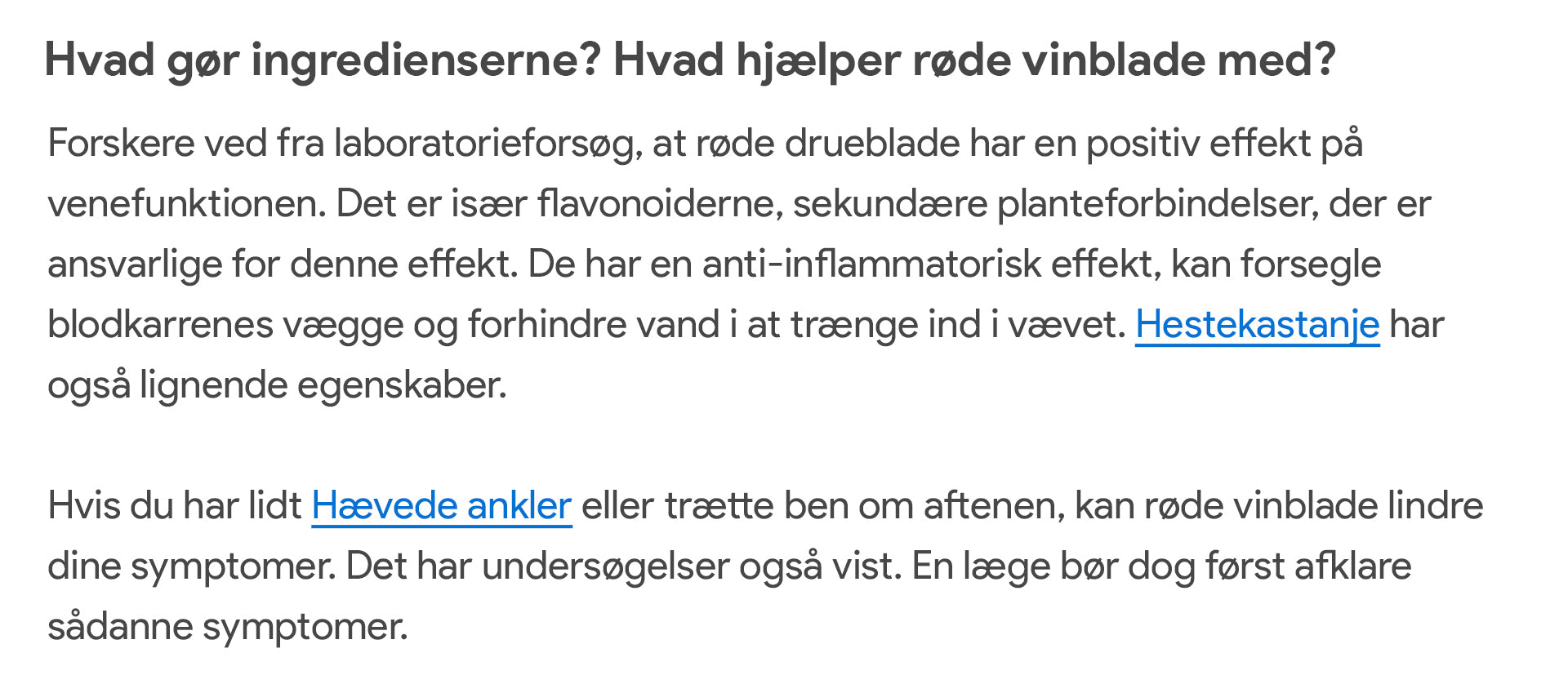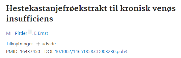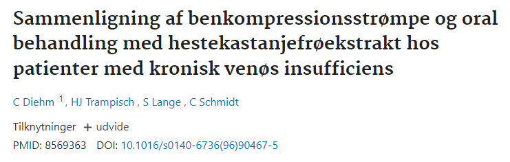 Ekstrakt af hestekastanjefrø til kronisk venøs insufficiens (https://pubmed.ncbi.nlm.nih.gov/16437450/) Sammenligning af benkompressionsstrømper og oral behandling med ekstrakt af hestekastanjefrø hos patienter med kronisk venøs insufficiens (https://pubmed.ncbi.nlm.nih.gov/8569363/) AOK Hessen - Hestekastanje som lægeplante: til hævede fødder og tunge ben: (https://www.presseportal.de/pm/117410/4262242)Apotek Umschau - Røde vinblade, rød vin: (https://www.apotheken-umschau.de/medikamente/heilpflanzen/rotes-weinlaub-rote-weinrebe-736321.html)