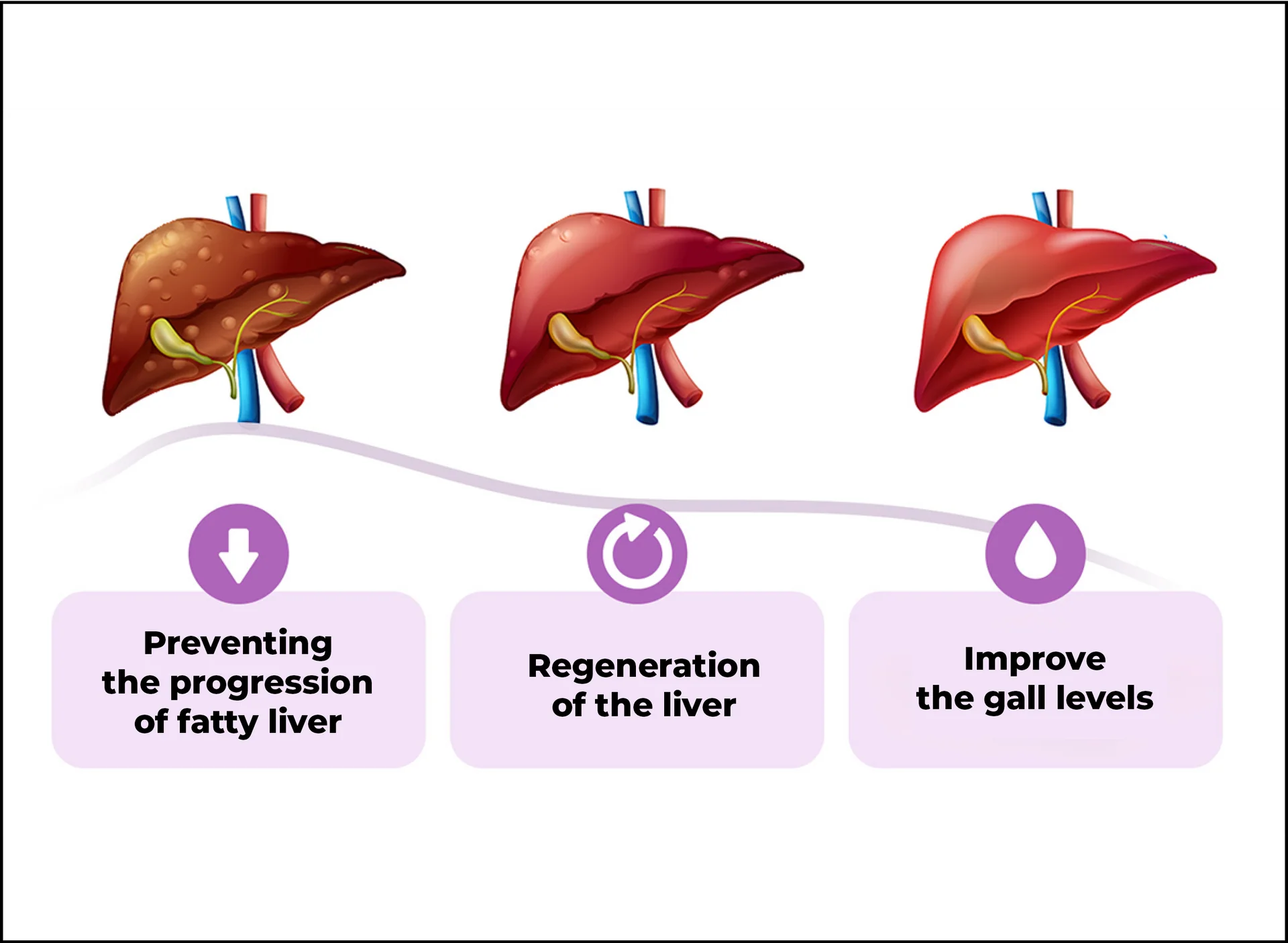 Healthy liver –> more energy –> higher calorie consumption –> less body fat –> less fat on the liver