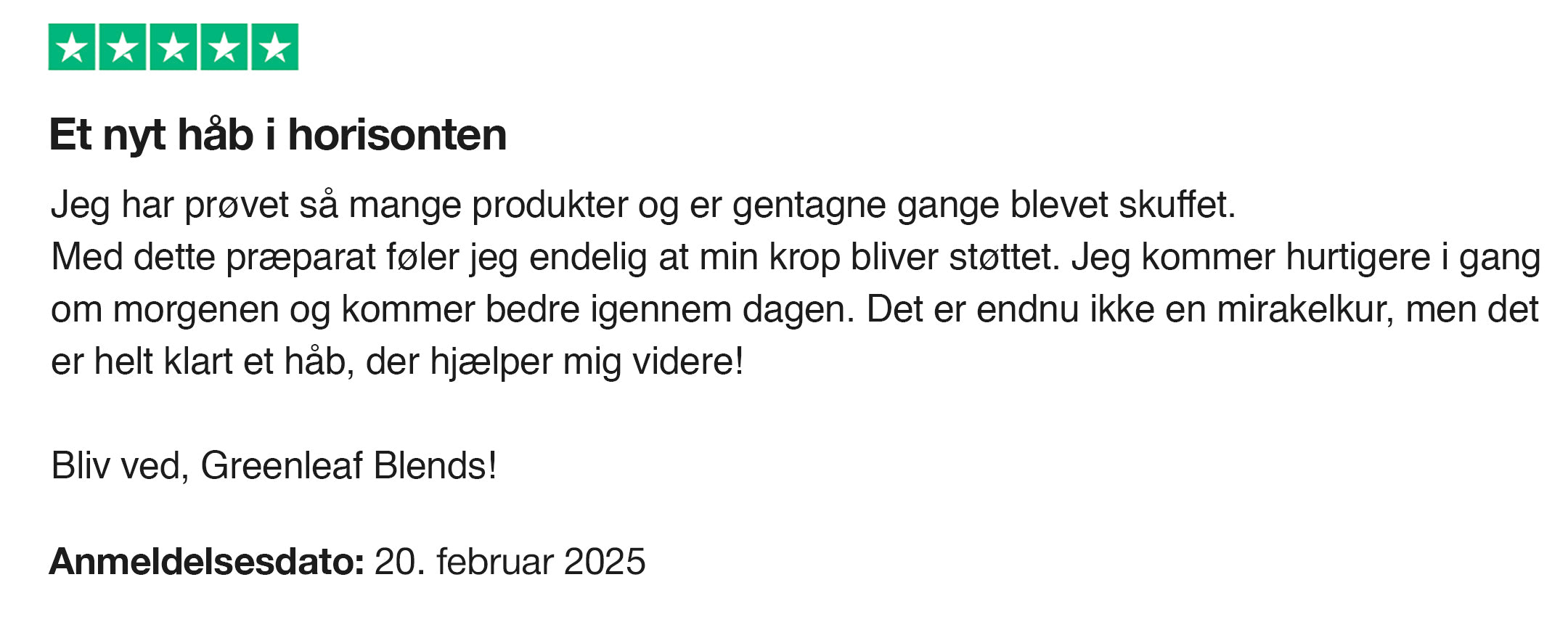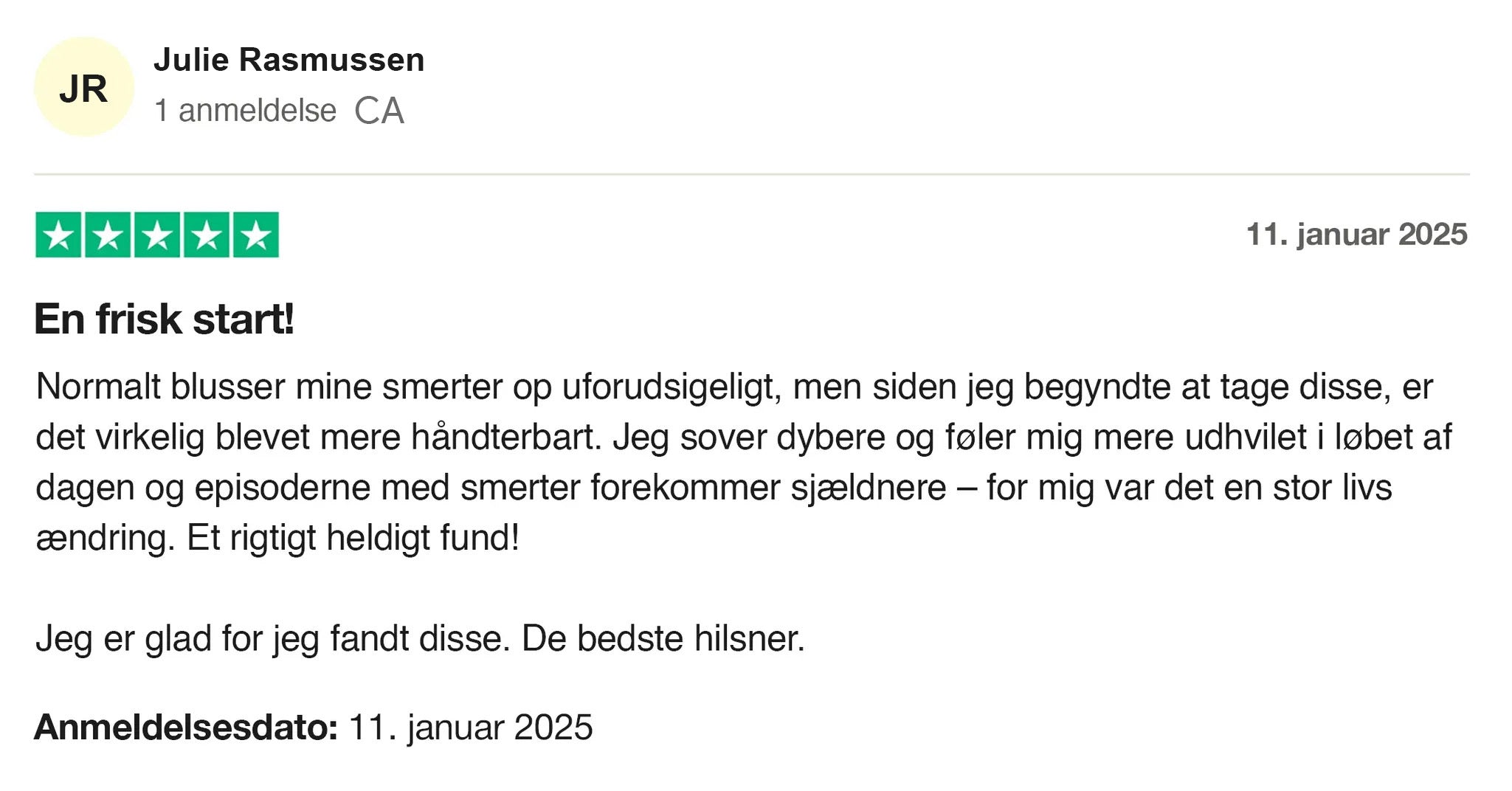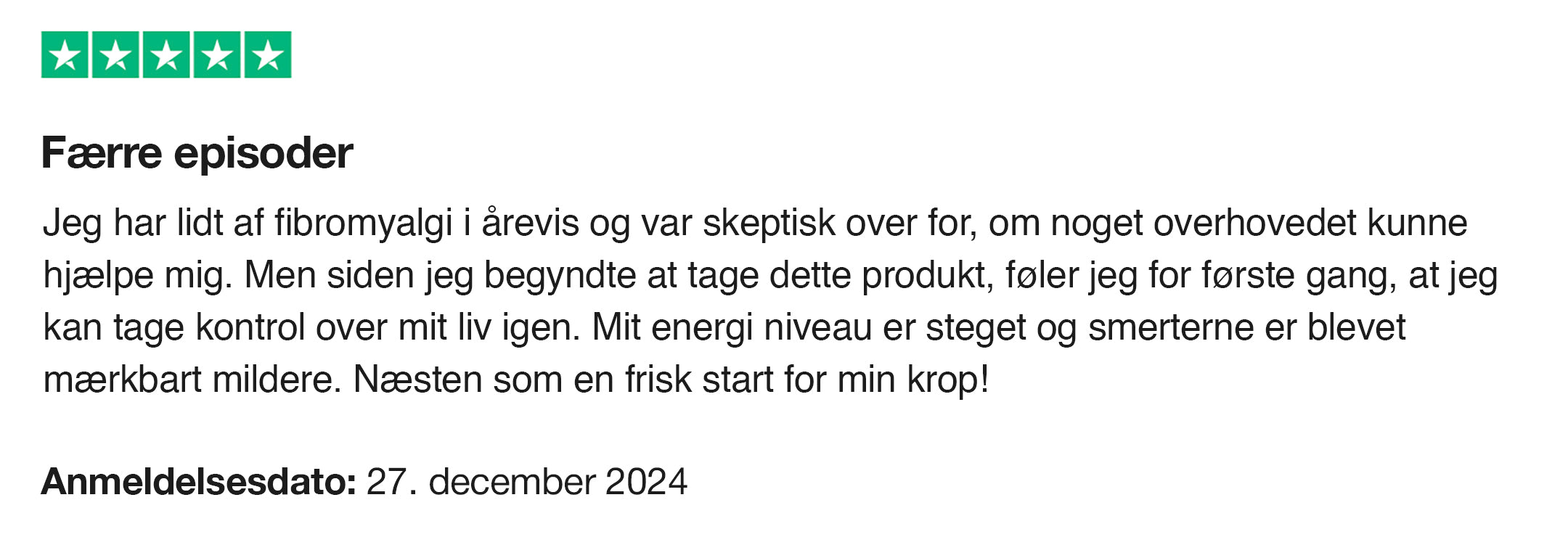 - Efter 6–8 uger: Jeg lagde mærke til, at mit generelle smerteniveau faldt, og at mit energiniveau blev mere stabilt. Ikke en mirakelkur, men en tydelig forskel.